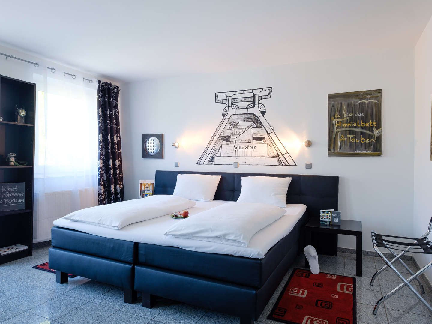 Geniessen Sie eine schöne und ereignisreiche Zeit in der immernoch "grünen Stadt Europas". Freundliches Personal begrüßt Sie mit einem Willkommensgetränk am Empfang. Geniessen Sie diesen bei einer unserer, imerwieder wechselnden, Kunstaustellungen in der Hotellobby. Mehrmals im Jahr stellen wir Arbeiten von Nachwuchs-, und erfahrenen Künstlern aus der Umgebung aus. Unsere Zimmer sind modern und einzigartig eingerichtet. Kein Zimmer gleicht dem anderen und alle haben ein anderes Motto bzw. Thema. Starten sie perfekt in den Tag mit unserem sehr schönen und üppigen Frühstücksbuffet. Frisch gestärkt können Sie mit einem Fahrrad, von unserem Fahrradverleih (nach Verfügbarkeit 7,50€), in kürzester Zeit die schönsten Ecken Essens erreichen. Zum Beispiel Richtung Baldeneysee, Villa Hügel oder der Zeche Zollverein, verbinden sie Natur mit Kultur und Erlebnis. Stadtrundfahrten und Fahrten in angrenzende Städte können Sie am nur 5 Gehminuten entfernten Hauptbahnhof beginnen.Die Innenstadt ist ein Katzensprung von unserem Hotel entfernt und bietet ihnen alles was das Herz begehrt. Bummeln, shoppen, Restaurants, Bars, Cafes und Nachtclubs laden sie ein. Wir helfen Ihnen gerne bei Buchungen für Musicals, Theater, Variete-, und Konzertveranstaltungen. Das Legoland und Sealife sowie der Moviepark in Bottrop sind ebenfalls schnell zu erreichen und auch hier gibt es oft günstige Angebote bei uns an der Rezeption zu kaufen. Wir freuen uns auf sie und wünschen eine angenehme Anreise