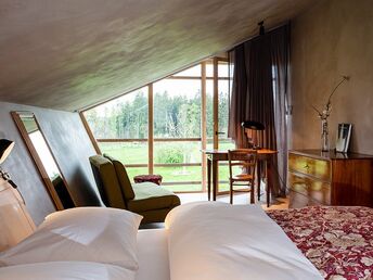 "Wie beschreibe ich Sonnenhausen? Vielleicht so: das etwas andere Hotel inmitten der bayerischen rolling hills. Zwei denkmalgeschützte Häuser, die für alle Anlässe einen schönen Rahmen bieten: Gutshof & Bauernhaus. Ihr Georg Schweisfurth" Der denkmalgeschützte Gutshof: das ist eine stilvoll erweiterte Architektur aus über 120 Jahren, die auch mal Brüche wagt. Das ist Kunst, die dem Besucher auf Schritt und Tritt begegnet – mal ästhetisierend, mal sperrig und fordernd. Kulinarik, die kreativ regionale Produkte verfeinert. Die Pflege der Natur und der Gärten nach ökologischer Überzeugung. Der denkmalgeschützte Gutshof bietet aber gerne auch den Rahmen für kleinere oder größere Musikkonzerte sowie Vorträge über gesellschaftliche und nachhaltige Themen … . Wir hier auf Sonnenhausen leben eine Kulturauffassung, die versucht, die Dinge in ihren natürlichen Zusammenhängen zu begreifen. Eine Welt für sich – gelassen und neugierig. Im Gutshof befinden sich die Standardzimmer und Superiorzimmer. Das Bauernhaus: Historische Vertäfelungen aus dem Alpenraum, 220 Jahre alte Balken, Ziegel, Lehm und Fichtenholz – im neuen Bauernhaus Sonnenhausen herrscht Wohlfühlklima. Wie in ganz Sonnenausen üblich wird auch hier Historisches und Hochmodernes zusammengebracht. Das drückt sich neben der Kunst, die in Sonnenhausen immer dabei ist, und der Möblierung auch in der Architektur aus. Im Bauernhaus befinden sich die Doppelzimmer de Luxe und Junior Suiten.