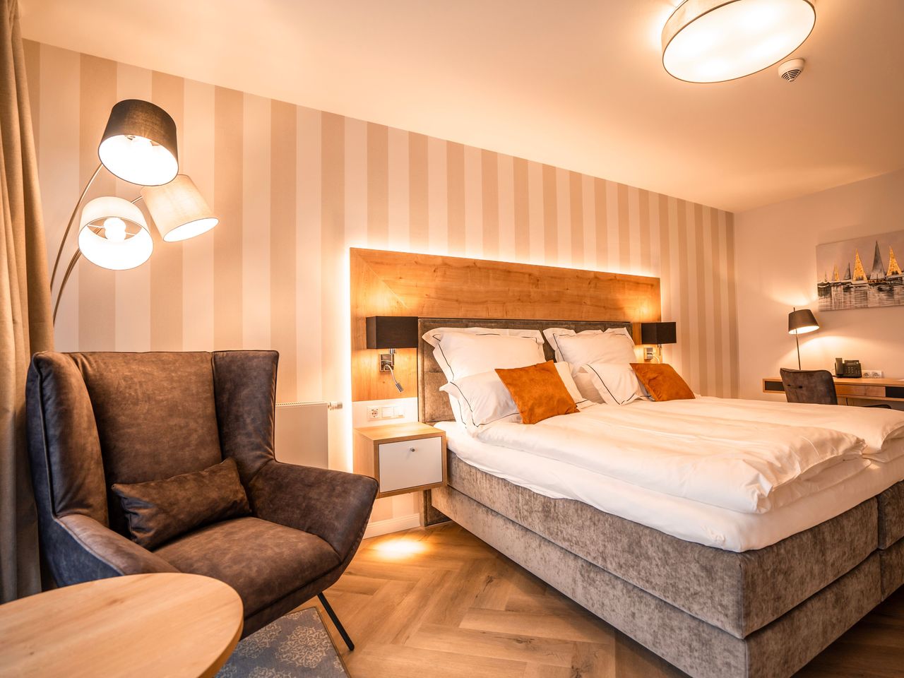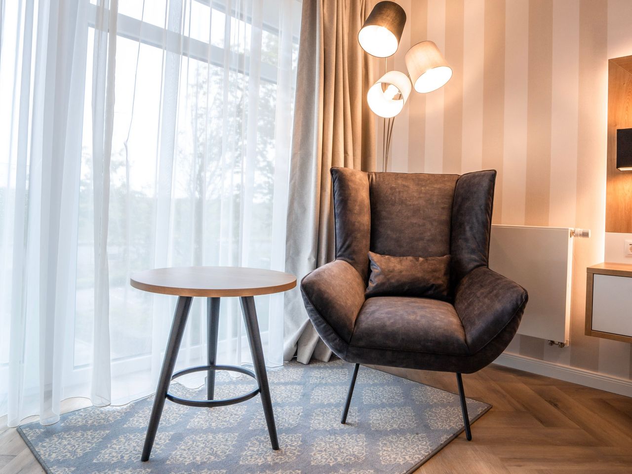 Alle 62 barrierefreien Zimmer sind großzügig geschnitten und bieten viel Bewegungsfreiheit. Wände und Fußböden sind in freundlichen überwiegend hellen und beigen Farben gehalten. Durch die großen Fensterfronten wirken die Zimmer einladend und lichtdurchflutet, so dass auch die hochwertige Einrichtung perfekt zur Geltung kommt. In allen Zimmern stehen Ihnen luxuriöse Boxspringbetten in der Größe 180x200cm mit Topper, gemütliche Ohrensessel mit Beistelltischen, hochwertige Schrankkombinationen mit Kapselmaschinen und Wasserkocher für Kaffee- Teezubereitung, Schreibtische, große 55‘‘ Zoll Smart-TVs (mit internationalen Sendern), freies WLAN, Telefone, Safe, Kofferbock und Wellnesstasche mit Bademänteln zur Verfügung.