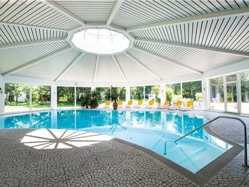 Nutzung des großzügigen Wellnessbereichs mit Hallenbad, Outdoor-Sauna, Finnischer Sauna, Textilsauna, Wassertretbecken und Ruheräumen