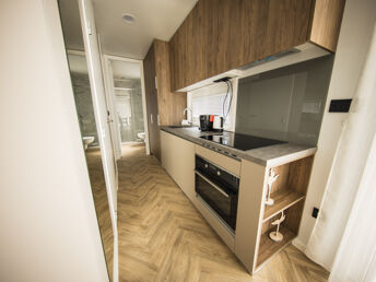 Voll ausgestattete moderne Küche mit hochwertigen Geräten und Geschirr, Induktionskochfeld, Backofen, Mikrowelle, Dunstabzug, Geschirrspüler, Edelstahl-Spüle, Kühlschrank mit Tiefkühlfach, Mülltrennsystem, Kaffeemaschine der Marke „Tchibo“ inkl. Kapseln - 6 Stk. kostenlos- , Wasserkocher, Geschirr für 5 Personen.