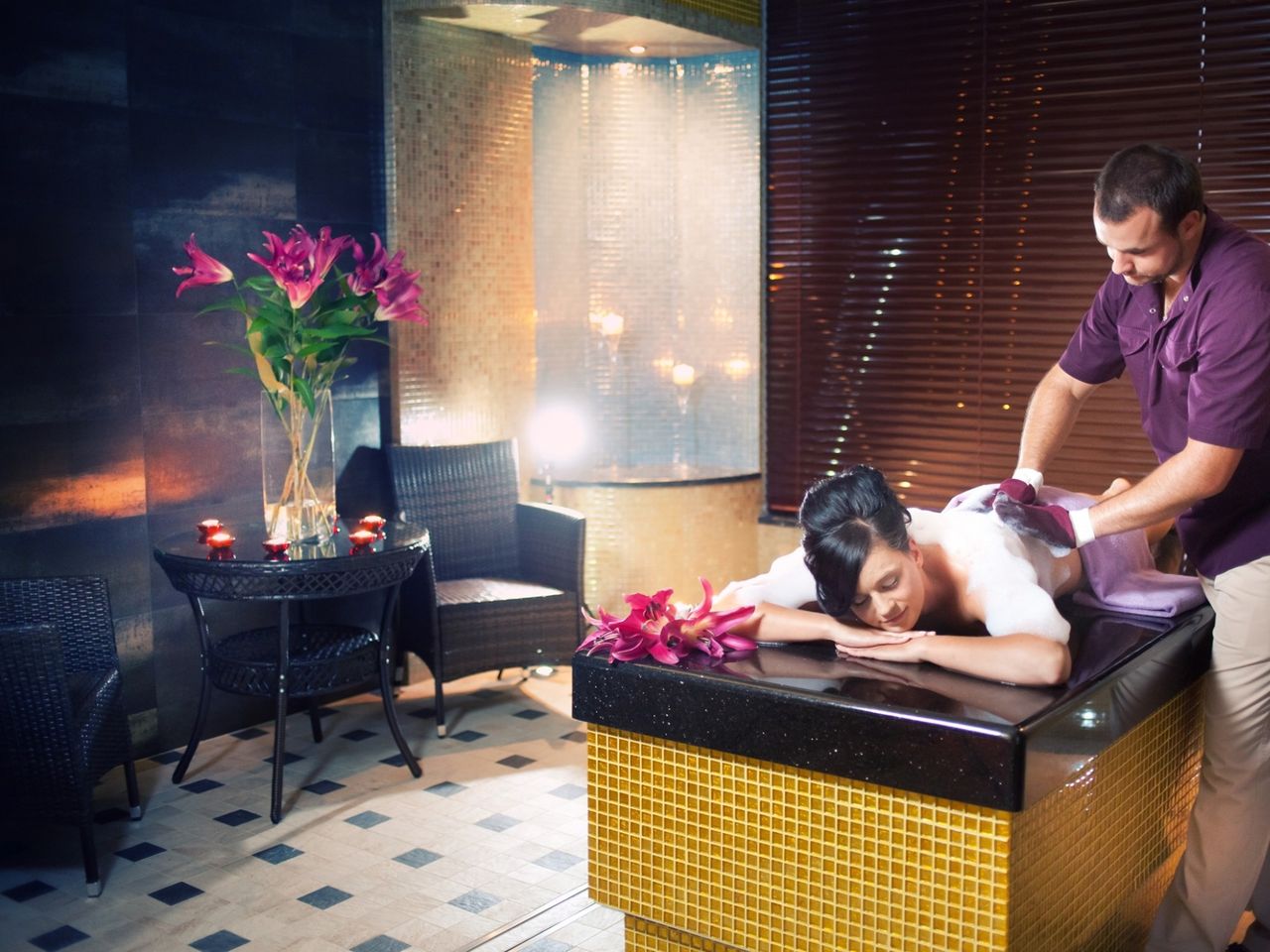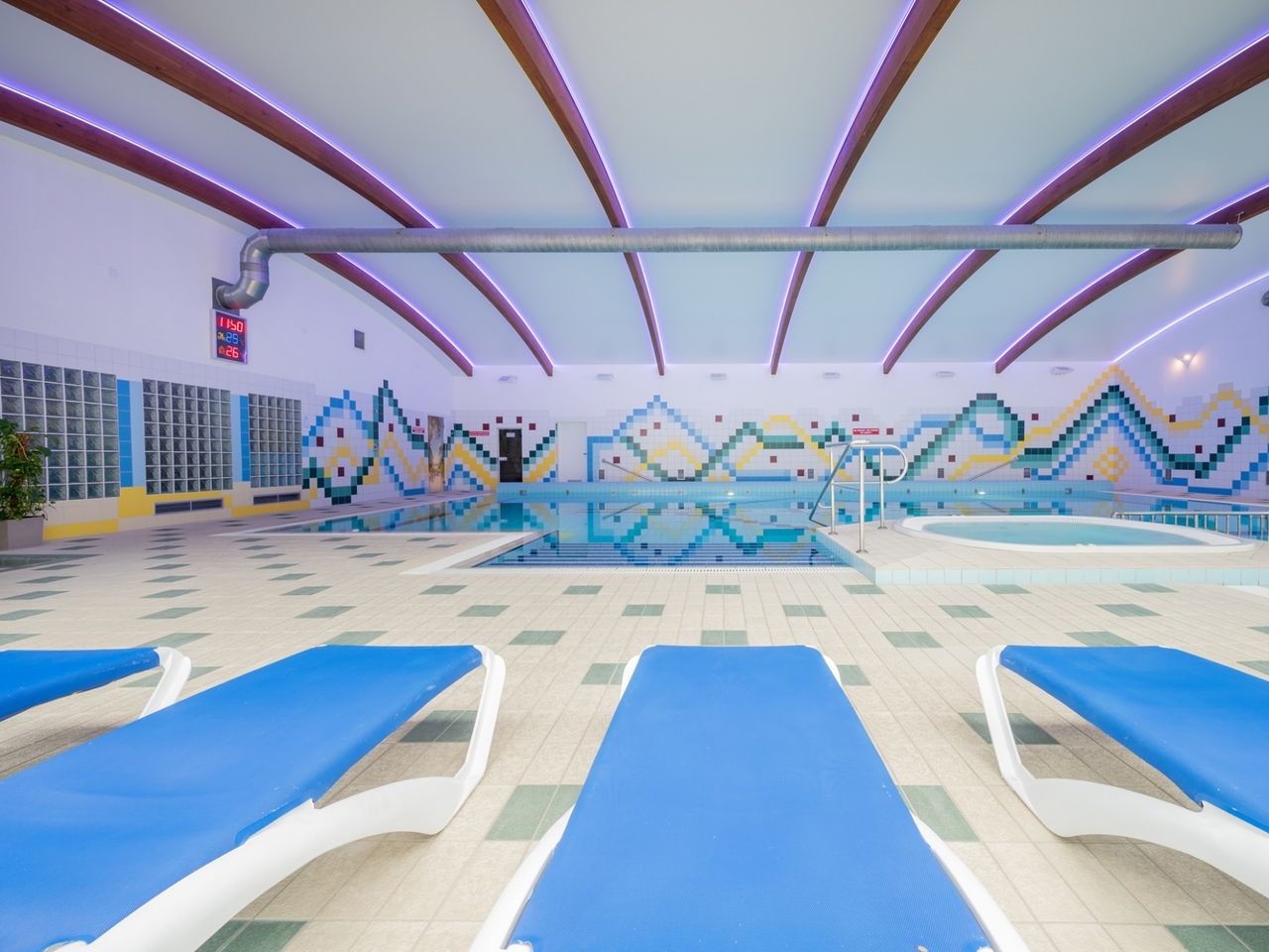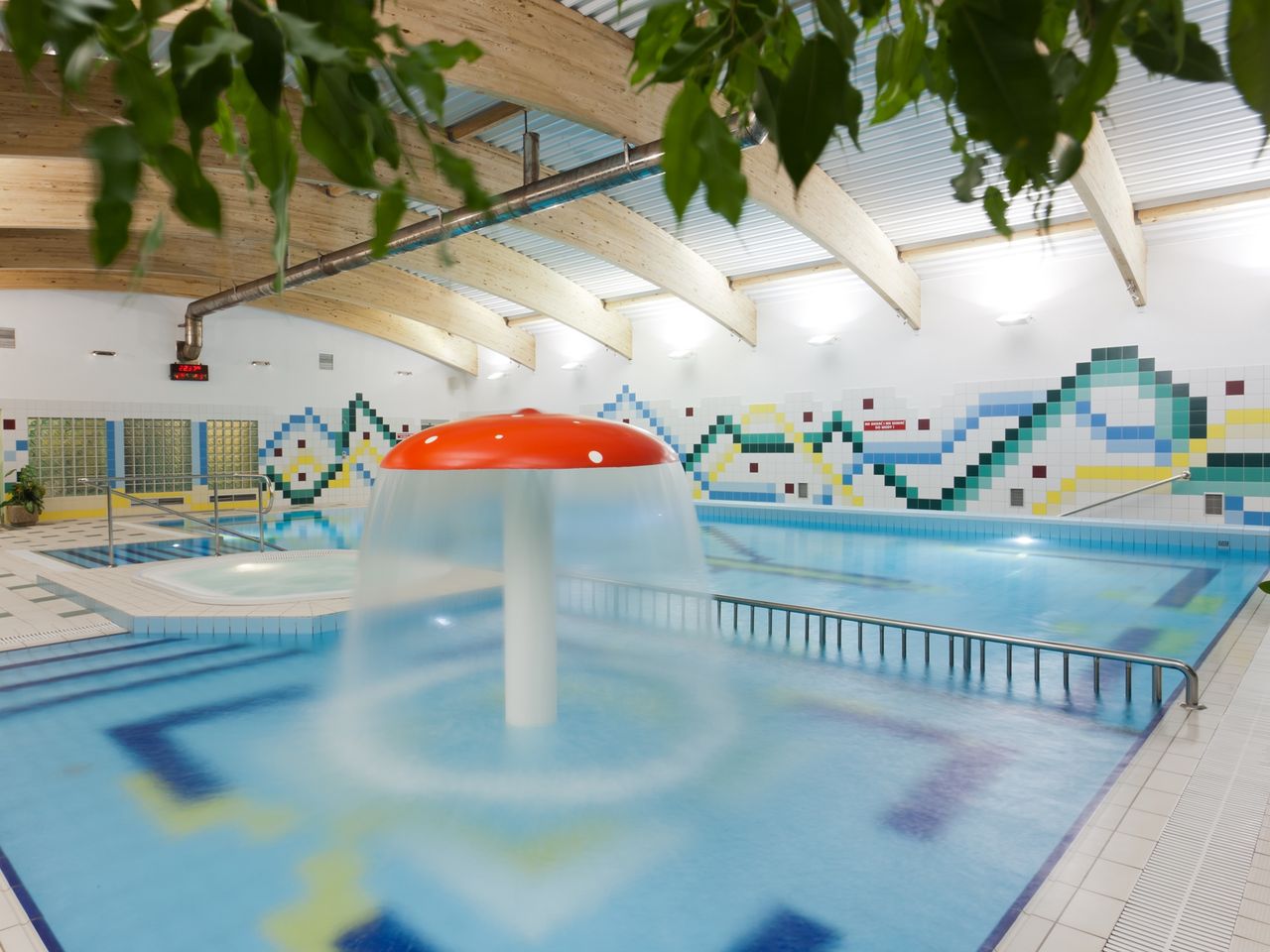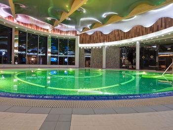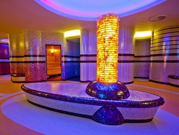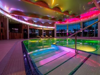 Große, professionelle Kur- und Wellnessabteilung, Fitnessraum, Kosmetiksalon, Salzgrotte, Hallenbad (Treppeneinstieg, 16 x 8 m), Dampfbad, Whirlpool, Kinderbecken, SPA-Bereich u.a. mit Salzbecken (ca. 10 m, ca. 34-36°C) mit echtem Salz aus dem Toten Meer, Salzsauna mit Gradierwerk, Dampf-, Trocken-, Biosauna, Erlebnisduschen, Tauchbecken, Kneipp-Becken für die Füße, Jacuzzi in der Steingrotte, Außenwhirlpool.